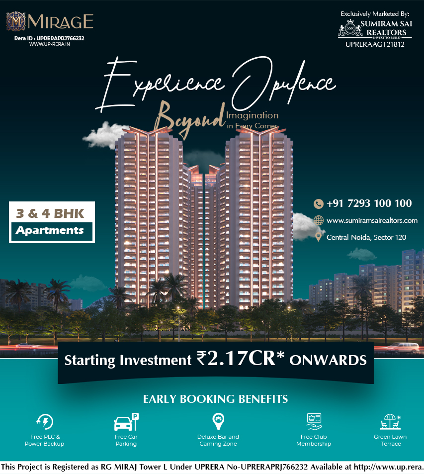 Situated in Noida's Sector 120, RG Mirage is a stunning Luxury residential development covering 2.27 acres. The building consists of two 28-story high-rise towers (G+28) that provide large 3/4 BHK + study apartments. These apartments have an amazing 11-foot ceiling and range in size from 2180 to 2845 square feet, providing an open and spacious living area.